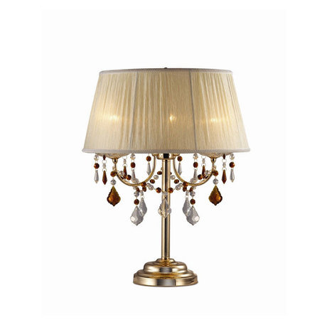 светильник настольный с абажуром из плиссированной ткани и подвесными элементами из огранённого хрусталя, золотой цвет металла эффектно гармонирует с хрустальными подвесками насыщенного янтарного цвета