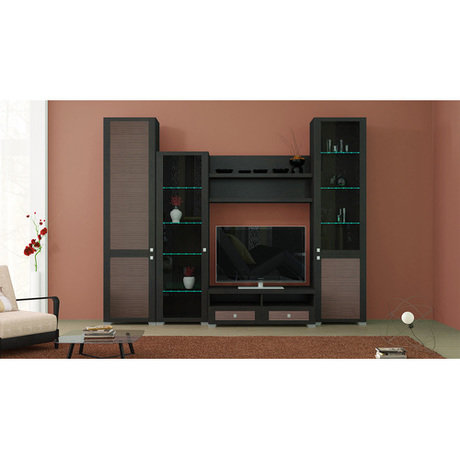 Уютная гостиная с набором самой необходимой современной мебели в приятной цветовой гамме: каркас выполнен в благородном цвете венге цаво, а фасад имеет два оттенка - венге цаво и каналы дуба. В состав набора входит: шкаф высокий комбинированный - 1 шт., шкаф высокий с глухими дверями - 1 шт., полка малая - 2 шт., тумба малая - 1 шт., шкаф низкий со стеклянными дверями - 1 шт.