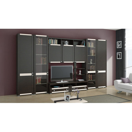Уютная гостиная с набором самой необходимой современной мебели в приятной цветовой гамме: каркас выполнен в благородном цвете венге цаво, а фасад имеет два оттенка - венге цаво и комби. В состав набора входит: шкаф высокий с глухими дверями - 2 шт., шкаф высокий со стеклянными дверями - 2 шт., шкаф навесной большой с глухими дверями - 1 шт., полка большая - 1 шт., тумба большая - 1 шт., секция открытая малая - 1 шт.