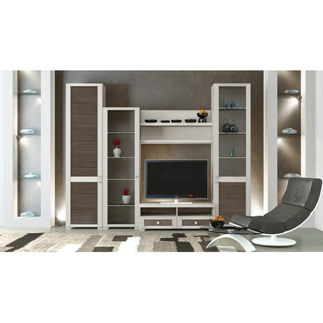 Уютная гостиная с набором самой необходимой современной мебели в приятной цветовой гамме: каркас выполнен в благородном светлом оттенке дуб белфорт, а фасад имеет два оттенка - дуб белфорт и каналы дуба. В состав набора входит: шкаф высокий комбинированный - 1 шт., шкаф высокий с глухими дверями - 1 шт., полка малая - 2 шт., тумба малая - 1 шт., шкаф низкий со стеклянными дверями - 1 шт.