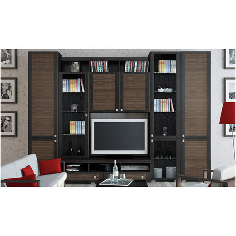 Уютная гостиная с набором самой необходимой современной мебели в приятной цветовой гамме: каркас выполнен в благородном цвете венге цаво, а фасад имеет два оттенка - венге цаво и каналы дуба. В состав набора входит: шкаф высокий с глухими дверями - 2 шт., шкаф высокий со стеклянными дверями - 1 шт., тумба большая - 1 шт., шкаф-надстройка - 1 шт., шкаф навесной -1 шт., полка большая - 1 шт.