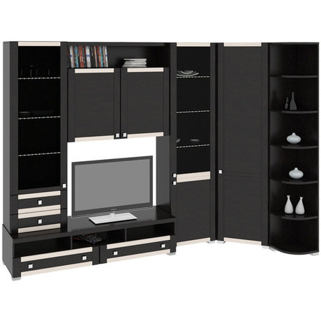 Уютная гостиная с набором самой необходимой современной мебели в приятной цветовой гамме: каркас выполнен в благородном цвете венге цаво, а фасад имеет два оттенка - венге цаво и комби. В состав набора входит: шкаф высокий комбинированный - 1 шт., шкаф навесной малый с глухими дверями - 1 шт., полка малая - 1 шт., тумба большая - 1 шт., шкаф угловой - 1 шт., стеллаж торцевой - 1 шт., шкаф-надстройка с ящиками - 1 шт.