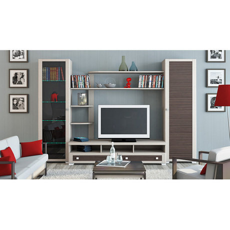 Уютная гостиная с набором самой необходимой современной мебели в приятной цветовой гамме: каркас выполнен в благородном светлом оттенке дуб белфорт, а фасад имеет два оттенка - дуб белфорт и каналы дуба. В состав набора входит: тумба большая - 1 шт., шкаф низкий с глухими дверями - 1 шт., шкаф низкий со стеклянными дверями - 1 шт., секция открытая средняя - 1 шт.
