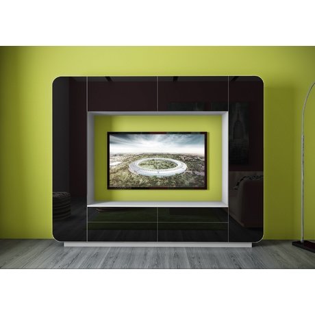 Современная стенка под телевизор ВасКо КУПЕРТИНО (белый/черный-белый) имеет с внешней стороны ярко-черное глянцевое покрытие.