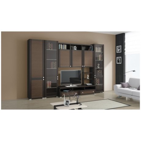 Уютная гостиная с набором самой необходимой современной мебели в приятной цветовой гамме: каркас выполнен в благородном цвете венге цаво, а фасад имеет два оттенка - венге цаво и каналы дуба. В состав набора входит: шкаф высокий с глухими дверями - 1 шт., шкаф высокий со стеклянными дверями - 2 шт., шкаф навесной большой с глухими дверями - 1 шт., полка большая - 1 шт., тумба большая - 1 шт., секция открытая малая - 1 шт.