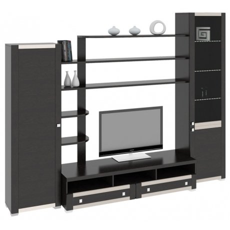 Уютная гостиная с набором самой необходимой современной мебели в приятной цветовой гамме: каркас выполнен в благородном цвете венге цаво, а фасад имеет два оттенка - венге цаво и комби. В состав набора входит: шкаф высокий комбинированный - 1 шт., тумба большая - 1 шт., шкаф низкий с глухими дверями - 1 шт., секция открытая большая - 1 шт.