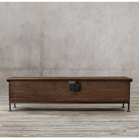 Кофейный столик 18th c. oak trunk long&lean - копия антиквариата 18 века. Как и у оригинального сундука, у него откидная крышка и железный остов замка. Подставка на ножках сделана из кованого железа. Использованы грубо обработанные дубовые доски. Места их соединений по методу "ласточкин хвост" специально выставлены напоказ, они выступают в роли декора.