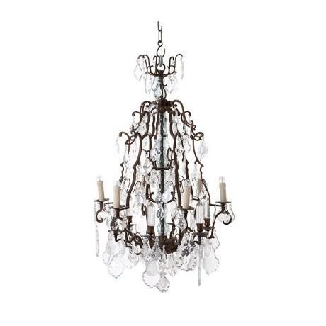 Люстра c хрустальными подвесками и тканевыми абажурами, цвет в ассортименте. Основание металлическое, цвет состаренная бронза. Диаметр 200 см x высота 120 см, с подвесом - 180 см. Диаметр плафона 14 см. Патрон Е14, мощность max 12 x 40W.