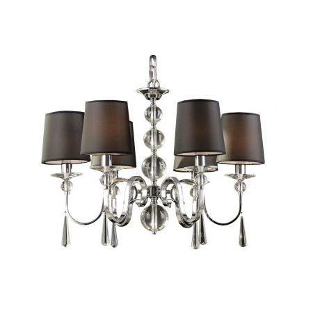 Металлическое основание хромированного цвета, тканевые абажуры белого цвета, прозрачные стеклянные подвески. Диаметр люстры 70 см, высота 64 см. Длина подвеса регулируется, можно использовать и без подвеса. Патрон E14, мощность max 6 х 60W.