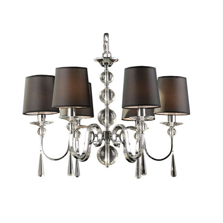 Металлическое основание хромированного цвета, тканевые абажуры черного цвета, прозрачные стеклянные подвески.