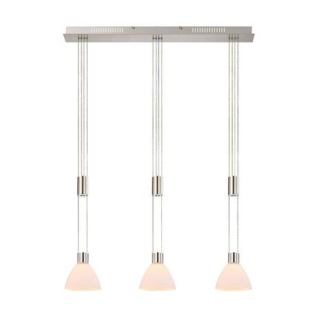 Назначение светильника: для комнаты, Стиль светильника: модерн, Тип: подвесная, Материал светильника: металл, стекло, Длина (мм): 145, Ширина: 80 мм, Высота: 1500 мм, Количество ламп: 3 шт., Тип лампы: светодиодная, Мощность: 5 Вт, Патрон: LED, Цвет арматуры: матовый никель