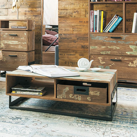 Стильный журнальный стол из массива тика с оригинальной отделкой, ноги выполнены из металла. По желанию можно дополнить модель ящиками для хранения.