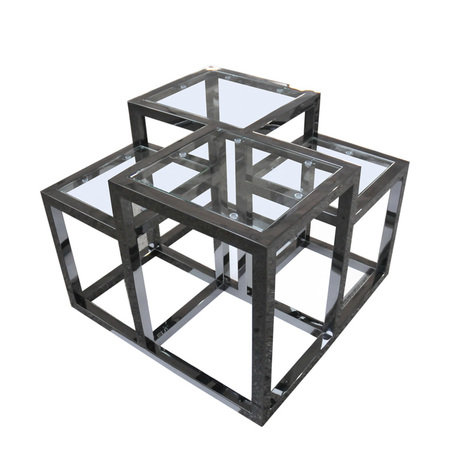Оригинальный многоуровневый кофейный столик из коллекции Cacharel выполнен из никелированного металла черного цвета. Столешницы выполнены из плотного стекла.