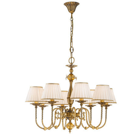 Подвесной светильник серии NAPOLI выполнен в классическом стиле. Восемь световых элементов расположены под элегантными плиссированными абажурами белого цвета. Металлическая основа с покрытием "золото 24 карата", выполнена вручную в виде скрученных стержней. Люстра декорирована элементами из муранского стекла: прозрачными розетками и сферами янтарного цвета. По индивидуальному заказу возможны различные модификации и варианты отделки.