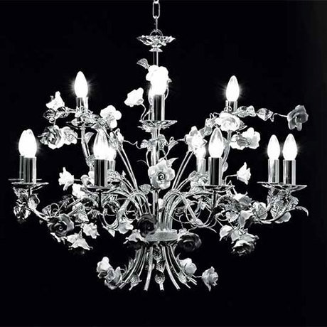 Подвесной светильник серии PARIS выполнен в виде двенадцати световых элементов, без абажуров. Основа люстры хромированный металл. Люстра декорирована элементами в виде листьев и стеблей, обработанных методом воздушно-плазменной резки металла и керамическими розами черного цвета. По индивидуальному заказу возможны различные модификации и варианты отделки. Дизайнер - Enrico de Girardi.