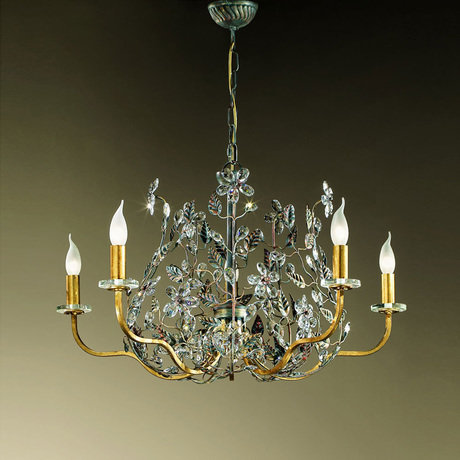 Люстра 5-ти рожковая на металлической кованной арматуре. Цвет арматуры: мультиколор с золотом. Декор: камни и кулоны в виде лепестков на металлических ветвях. Дизайн: Enrico de Girardi. По индивидуальному заказу возможны различные модификации и варианты отделки.