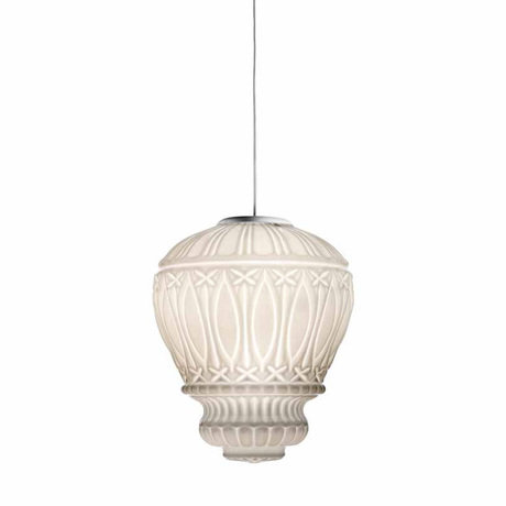 Подвесной светильник со стеклянным плафоном белого цвета с орнаметном. Арматура выполнена из хромированного металла. Высота светильника регулируется. Дизайн: Ufficio Tecnico MM Lampadari. По индивидуальному заказу возможны различные модификации и варианты отделки. Примеры цветовой палитры представлены в разделе PDF каталогов.