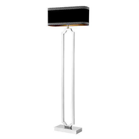 Торшер Floor Lamp Sterlington на основании из никелированного металла. Текстильный абажур черного цвета скрывает лампу.