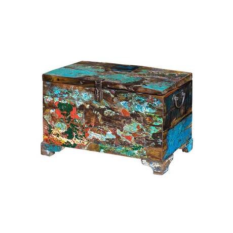 Сундук для хранения вещей, выполненный из старой рыбацкой лодки с сохранением оригинальной многослойной окраски.
