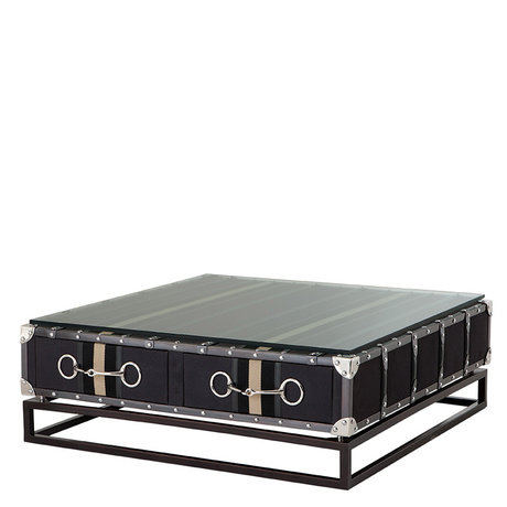 Журнальный столик Coffee Table Astoria на металлическом основании коричневого цвета. Декоративный элемент в виде чемодана черно-серого цвета под плотным стеклом.