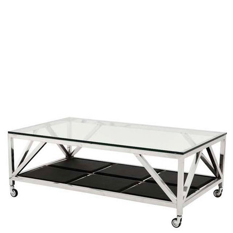 Журнальный столик Coffee Table Prado на колесиках с каркасом из нержавеющей стали. Столешница выполнена из плотного прозрачного стекла. Нижняя полка с отделкой из кожи черного цвета.