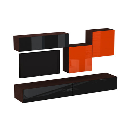 Композиция для гостиной. Все модули коллекции Сubo крепятся к стене. Двери шкафов и выдвижные ящики открываются по принципу «нажал-открыл».