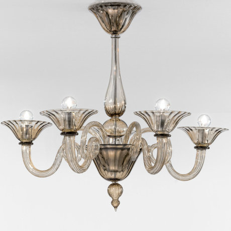 Люстра 5-ти рожковая на хромированной арматуре. Выполнена из муранского стекла дымчатого цвета. Высота светильника регулируется за счет звеньев цепи. Количество лампочек: 5. Мощность: 5 x 40 Вт. Тип лампы: Накаливания, E14.