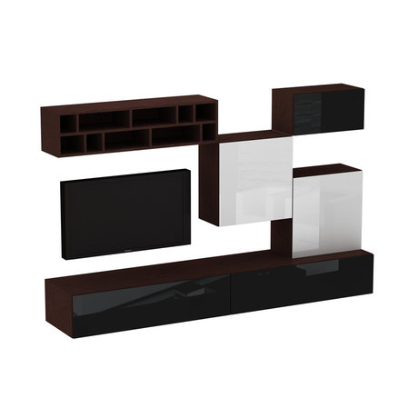 Композиция для гостиной. Все модули коллекции Сubo крепятся к стене. Двери шкафов и выдвижные ящики открываются по принципу «нажал-открыл».