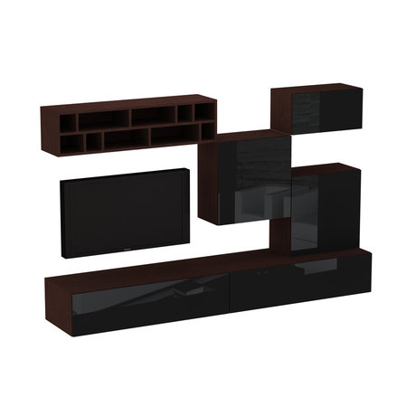 Композиция для гостиной. Все модули коллекции Сubo крепятся к стене. Двери шкафов и выдвижные ящики открываются по принципу «нажал-открыл».