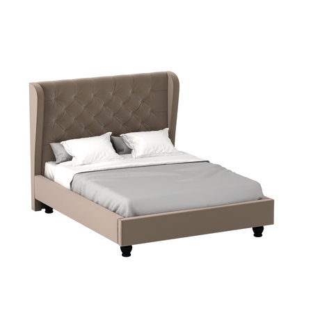 Двуспальная кровать с высокой спинкой и декоративными элементами. Спинка декорирована пуговицами. Кровать установлена на фигурные деревянные ножки. Выполняется в трёх вариантах размеров спального места: 200х200 см, 180х200 см и 100х200 см. Основание: металлическое с эластичными латами из фанеры.
