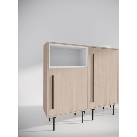 Комбинацию модулей F и B из коллекции Tube возможно использовать, как самостоятельно, так и в сочетании с другими модулями из этой коллекции. Комбинация оснащена нишей и 2-я секциями для хранения. В секциях установлены съемные полки. Материал: шпон дуба, мдф, металл, эмаль, лак.