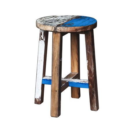 Табурет, выполненный из массива древесины старого рыбацкого судна, такой как: тик, махагони, суар, с сохранением оригинальной многослойной окраски.