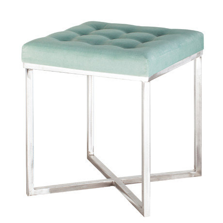Пуф с мягким сидением голубого цвета на металлических ножках. Он станет важным стилистическим акцентом в интерьере fashion или эклектика.